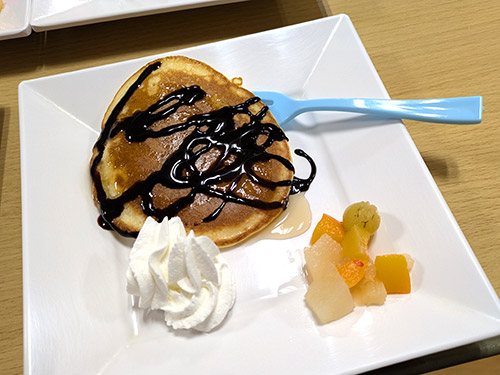 ホットケーキにクリーム、シロップ、チョコレート、フルーツのトッピングを楽しみました!